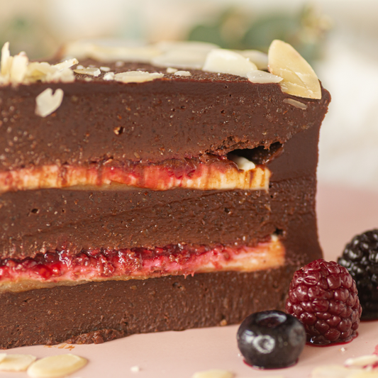Torta Chocolate Belga, salsa de frambuesa y caramelo salado