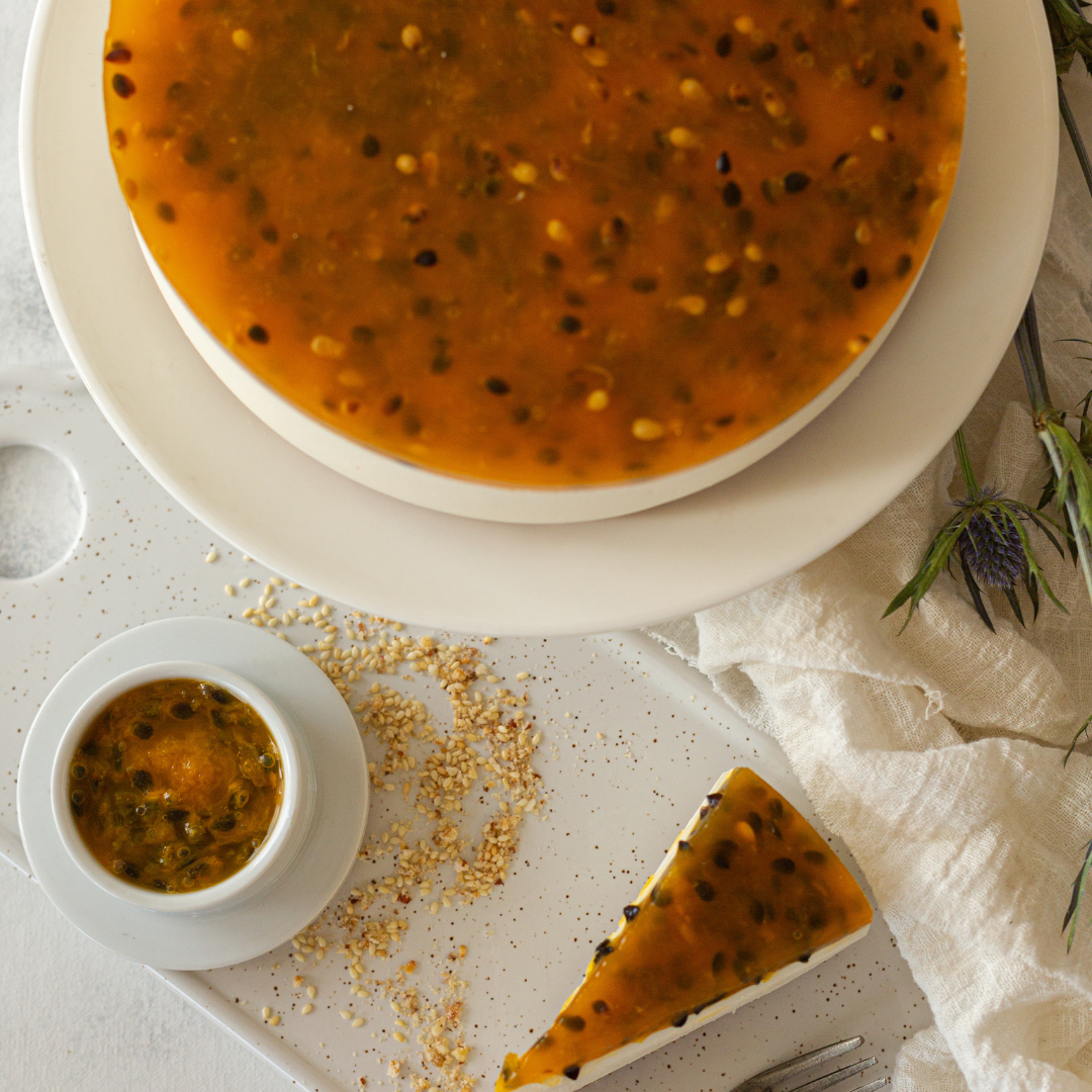 Suave, cremoso y perfectamente natural. Base de almendras y sésamo tostado, suave relleno de queso crema y topping de pulpa de maracuyá.
